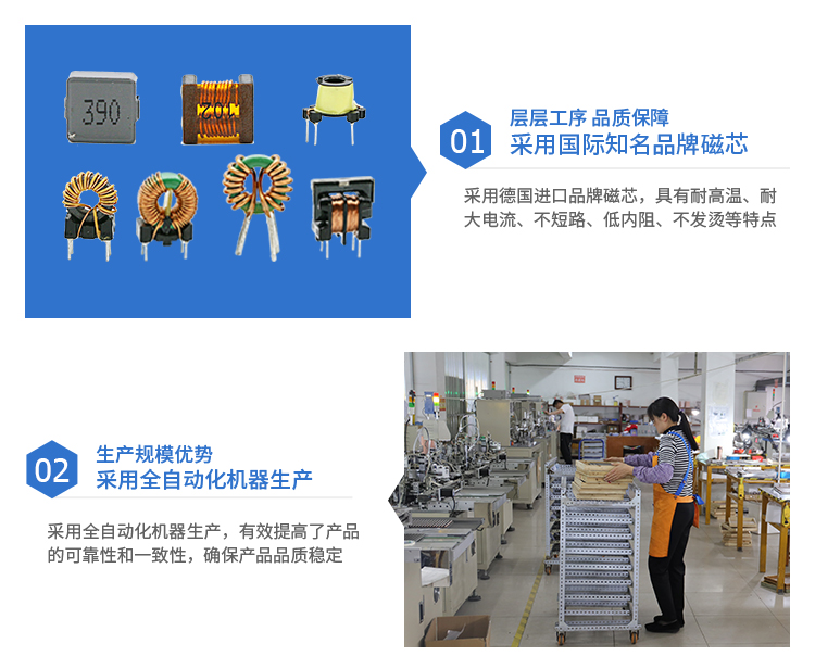 采用台产、日产进口磁芯和骨架,确保电感产品拥有更好的导电性以及耐电流性